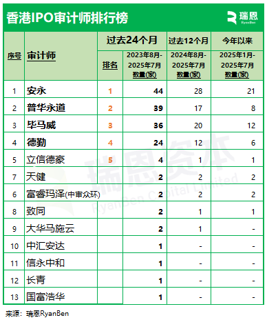 二、過去12個月的數(shù)據(jù)(2024年8月至2025年7月)就過去12個月的數(shù)據(jù)來看,這13間審計師中的9間參與 84家新上市公司的審計業(yè)務(wù)就過去12個月排名前四位的審計師分別是:安永、畢馬威、普華永道、德勤,分別參與 28家、20家、17家、12家,占比分別為33.3%、23.8%、20.2%、14.3%。