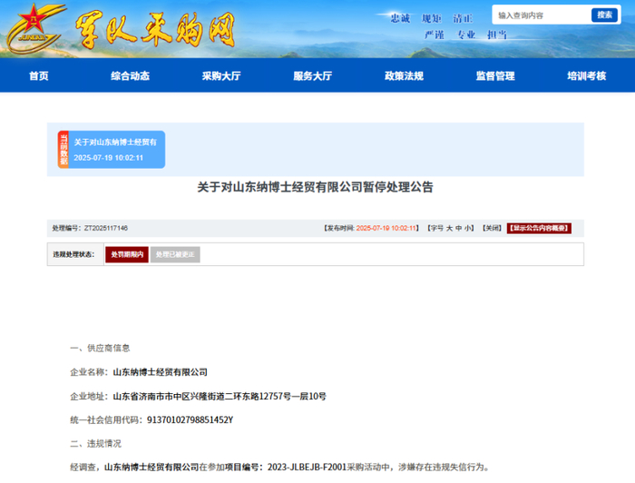 根據(jù)陸軍后勤部采購和資產(chǎn)管理局發(fā)布的《關(guān)于對山東納博士經(jīng)貿(mào)有限公司暫停處理公告》(編號:ZT2025117146),山東納博士經(jīng)貿(mào)有限公司在參加項目編號:2023-JLBEJB-F2001采購活動中,集團涉嫌存在違規(guī)失信行為。山東士超市王