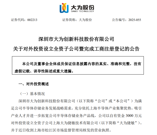 近日,上海大為股份發(fā)布公告稱,半導(dǎo)為滿足公司半導(dǎo)體存儲業(yè)務(wù)發(fā)展戰(zhàn)略需求,體基公司以自有資金3000萬元對外投資設(shè)立全資子公司上海大為捷敏技術(shù)有限公司(以下簡稱“大為捷敏”)。地上的半導(dǎo)體